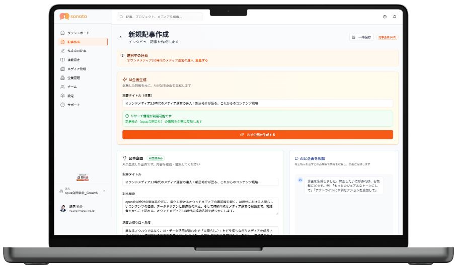 「オウンドメディアを任されたけど、どうやって運営したらいいの?」「インタビューや取材なんてやったことがないから、どこから手をつければいいの?」といった方から、「もっと効率よく高品質な記事を増やしたい」「限られた予算で、ブランド価値を高めるコンテンツを作りたい」といった上級者まで、長年オウンドメディアやブランドコンテンツ制作に携わってきた開発陣のノウハウを詰め込んだ「sonata」でご支援します。